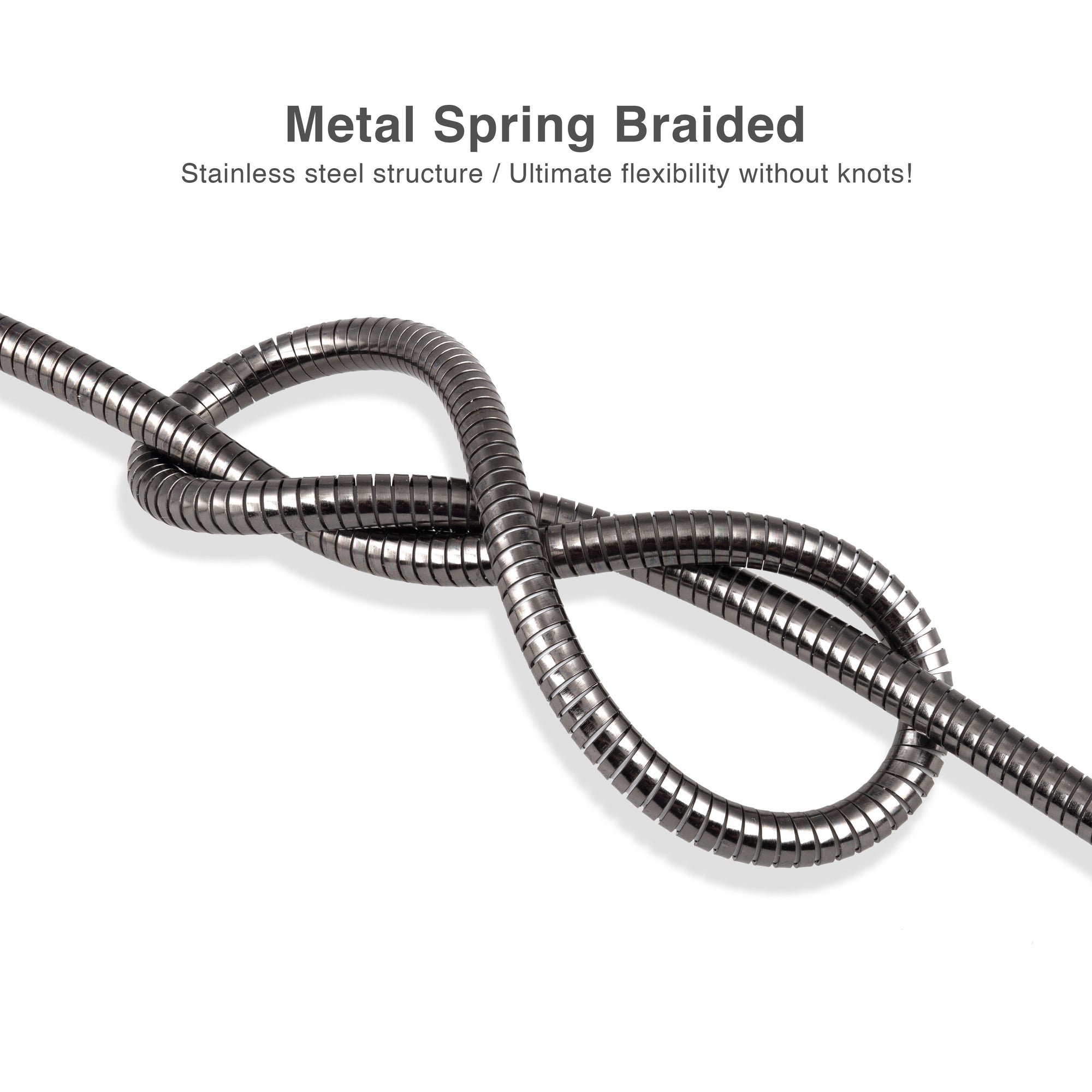 Introducing our new Premium Metal Spring Braided cables with metal connector ends. This new lineup features a flexible and tangle-free experience. Additionally, it is made with reinforced joints to avoid ruptures and breakage. Stainless steel structure for a longer-lasting experience. It is six times stronger than your traditional cables and supports high-speed charging and sync.