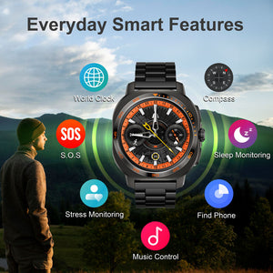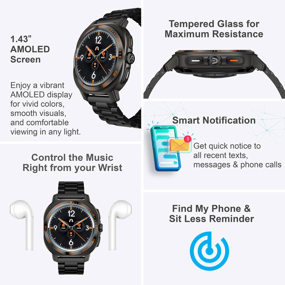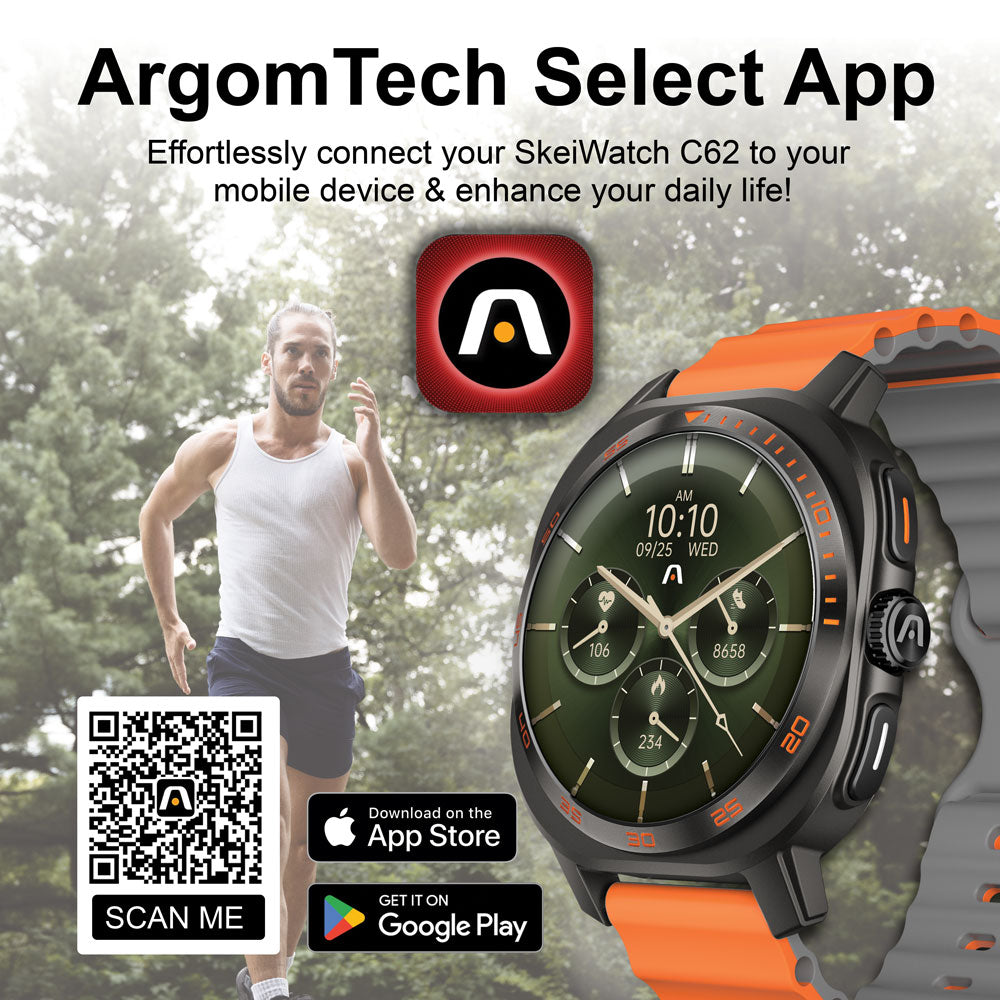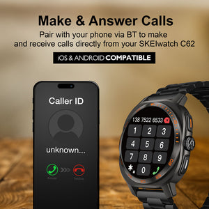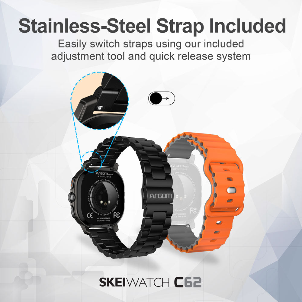 Designed for both performance and elegance, the SKEIWatch C62 features a brilliant 1.43” AMOLED display and 1ATM water resistance, offering protection from rain, splashes, and everyday exposure. Each watch includes two interchangeable straps—a stainless steel link band and a sport silicone band—giving you flexibility for both active and professional settings.